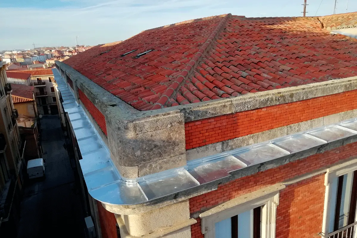 El Ayuntamiento de Zamora ha llevado a cabo un importante proyecto de impermeabilización en sus cornisas, utilizando bandejas de zinc de 80ml. Esta intervención tenía como objetivo principal proteger la estructura del edificio contra los daños causados por la humedad y el agua.